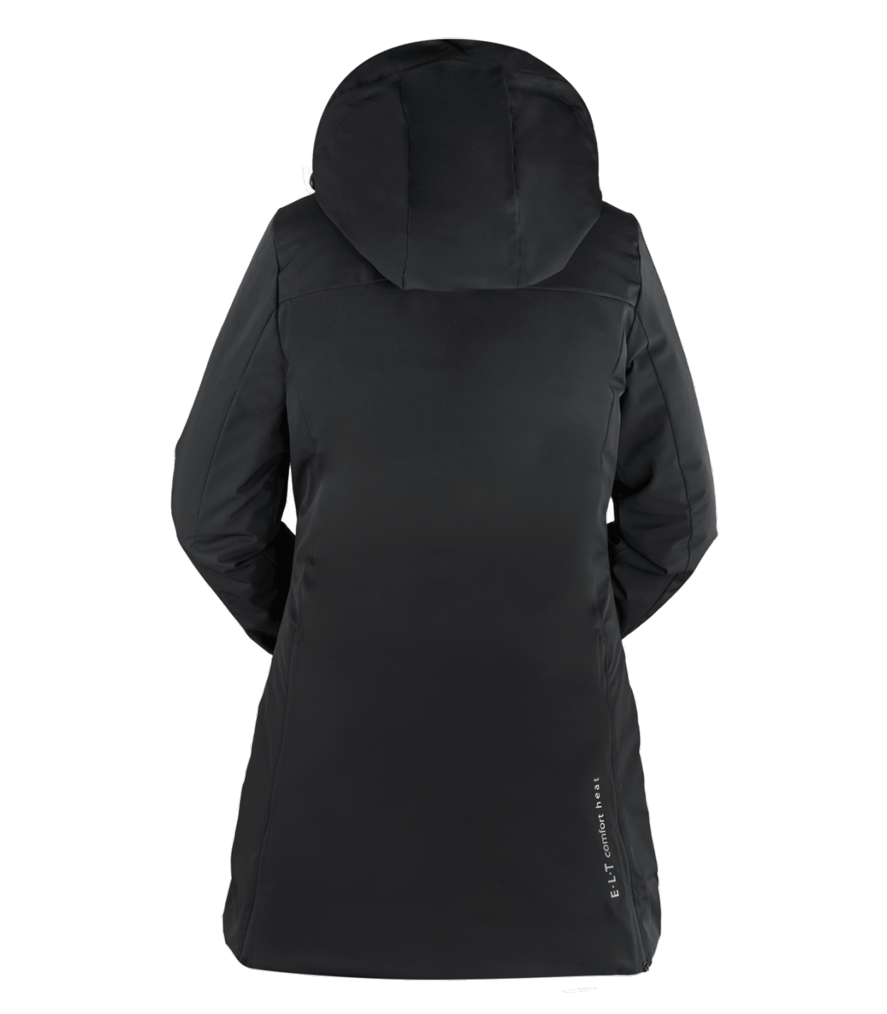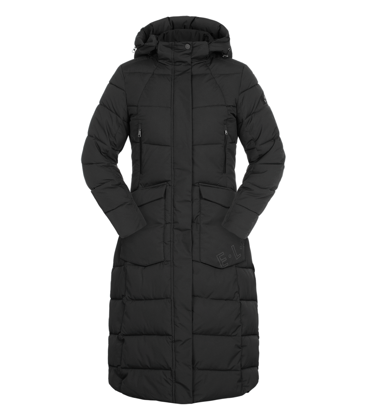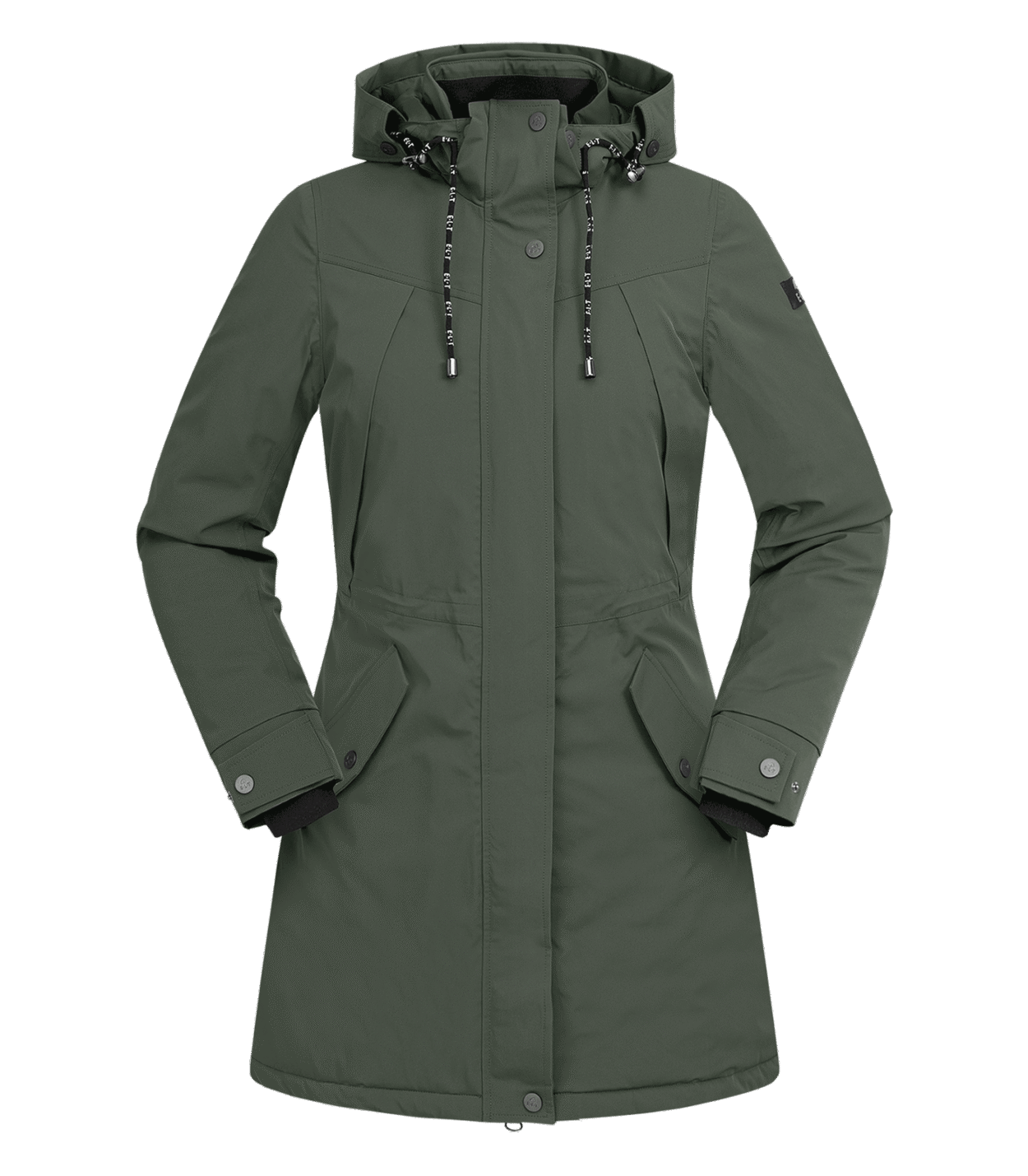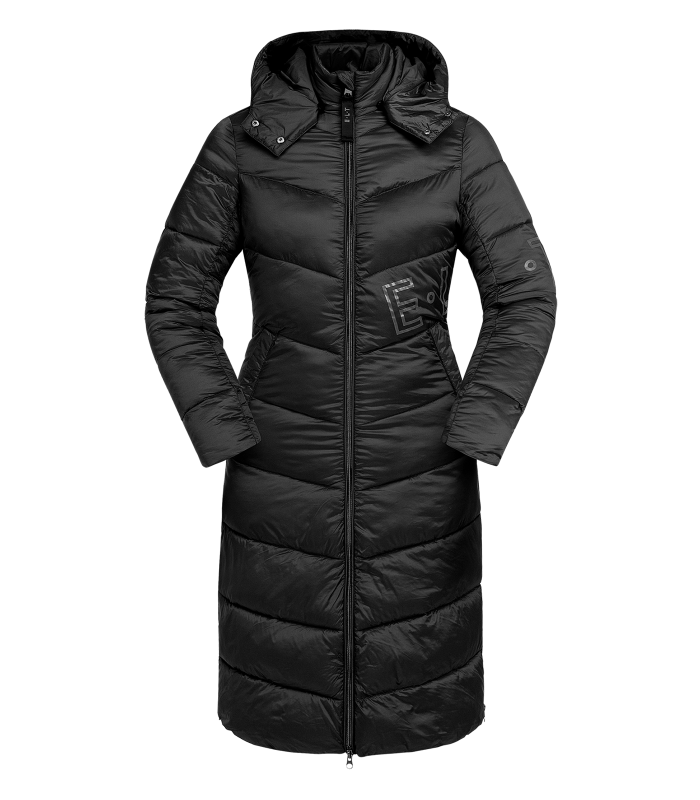 Hochfunktioneller Damen-Regenmantel mit umfangreicher Ausstattung- Weitenverstellbar in der Taille- Wasserdicht, Wassersäule 5.000mm- Atmungsaktiv, 3000g/m²/24h- Winddicht- Versiegelte Nähte- Weiches Micro-Fleece im Innenkragen- Kapuze helmtauglich, fixierbar am Rücken- Hochwertiger 2-Wege-Reissverschluss in Metalloptik mit Kinnschutz- Reißverschluss endet oberhalb des Sattels, um Beschädigungen am Leder zu vermeiden- Metall-Reißverschlusspuller mit E·L·T Logo in matt schwarz- Reißverschlüsse unter den Armen verbessern die Luftzirkulation- Brusttasche mit wasserdichtem Reißverschluss mit Semi Lock Puller und E·L·T Equestrian Performance Schriftzug- Zwei große, aufgesetzte Pattentaschen mit Druckknopf. Rechte Tasche mit E·L·T Equestrian Performance Schriftzug- Ärmelabschluss weitenverstellbar, mit innenliegenden Rippbündchen und reflektierendem Klettverschluss
