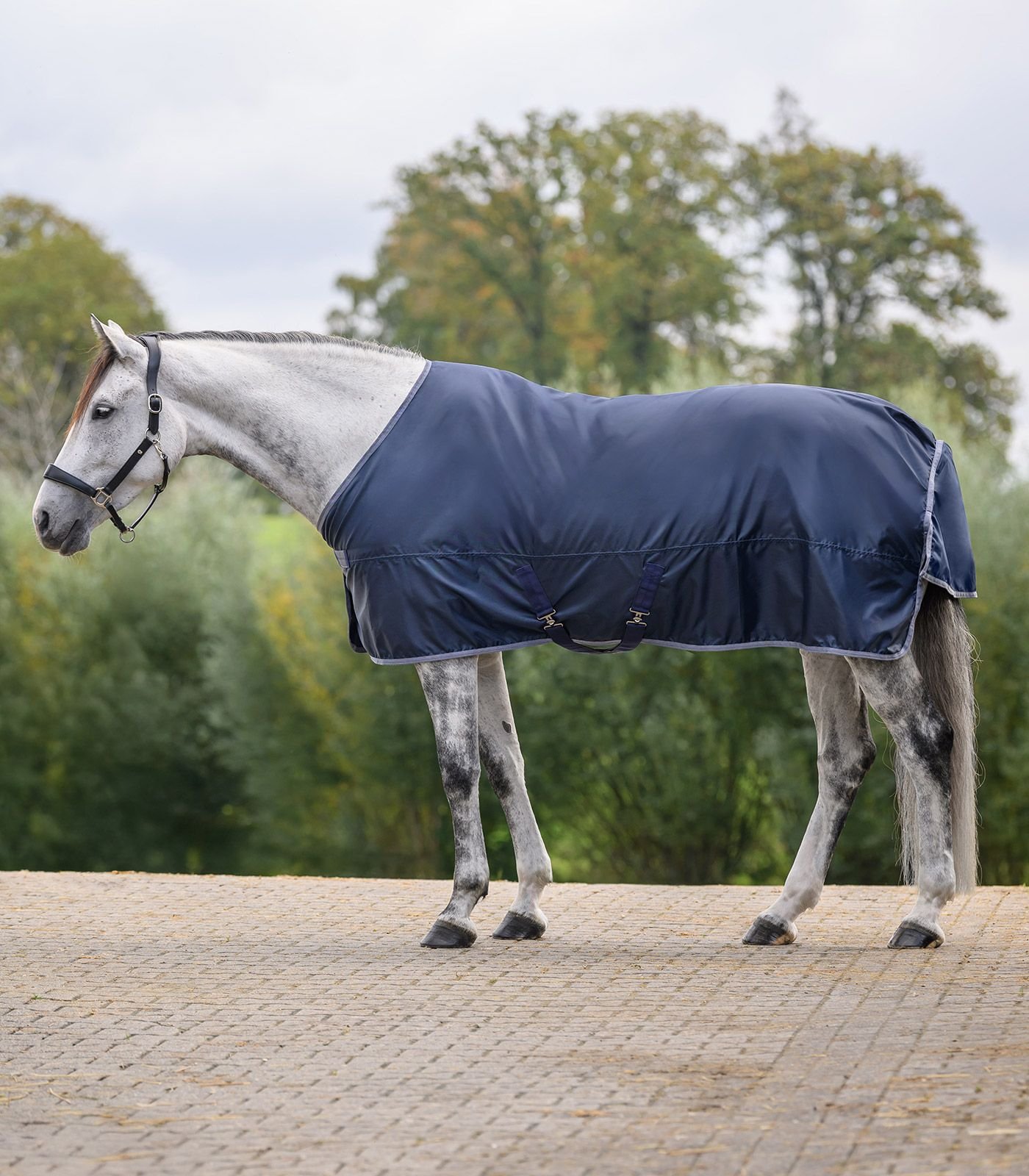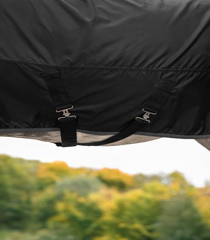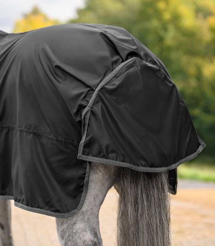 Die ECONOMIC Regendecke besteht aus wasserdichtem, leichtem 420-Denier-Polyester und bietet zuverlässigen Schutz bei Nässe. Das strapazierfähige Obermaterial sorgt für Langlebigkeit, während der integrierte Schweiflatz zusätzlichen Schutz vor Regen und Wind bietet. Die Frontverschnallung mit praktischem T-Verschluss ermöglicht eine einfache Handhabung.