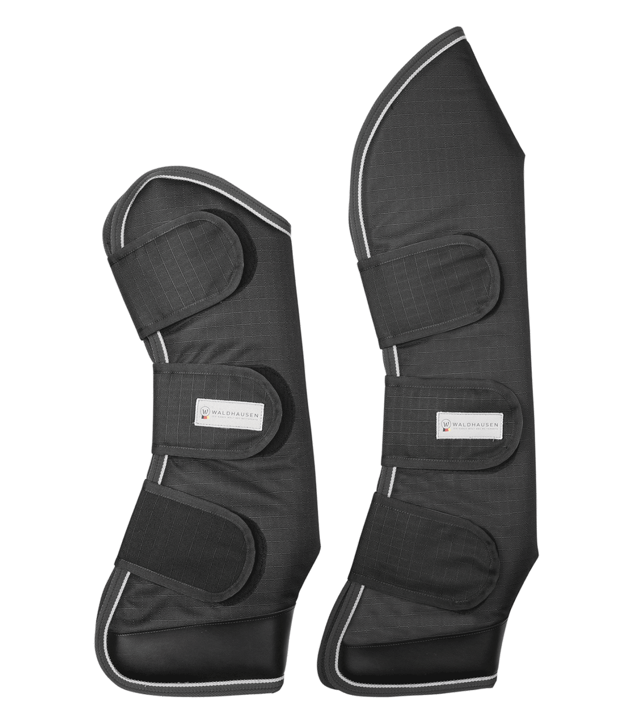 Hochwertige, anatomisch geformte Transportgamaschen mit drei starken Klettverschlüssen für optimalen Halt am Pferdebein. Bester Schutz durch 2,3 cm dicken, voluminösen Schaum im Inneren und hohen Schnitt. Extra weiches Fleece-Innenfutter sorgt für optimalen Tragekomfort. Strapazierfähiges, pflegeleichtes Außenmaterial. Verstärkung am Ballenbereich. In klassischer Farbkombination für einen stilvollen Auftritt auf Reisen.